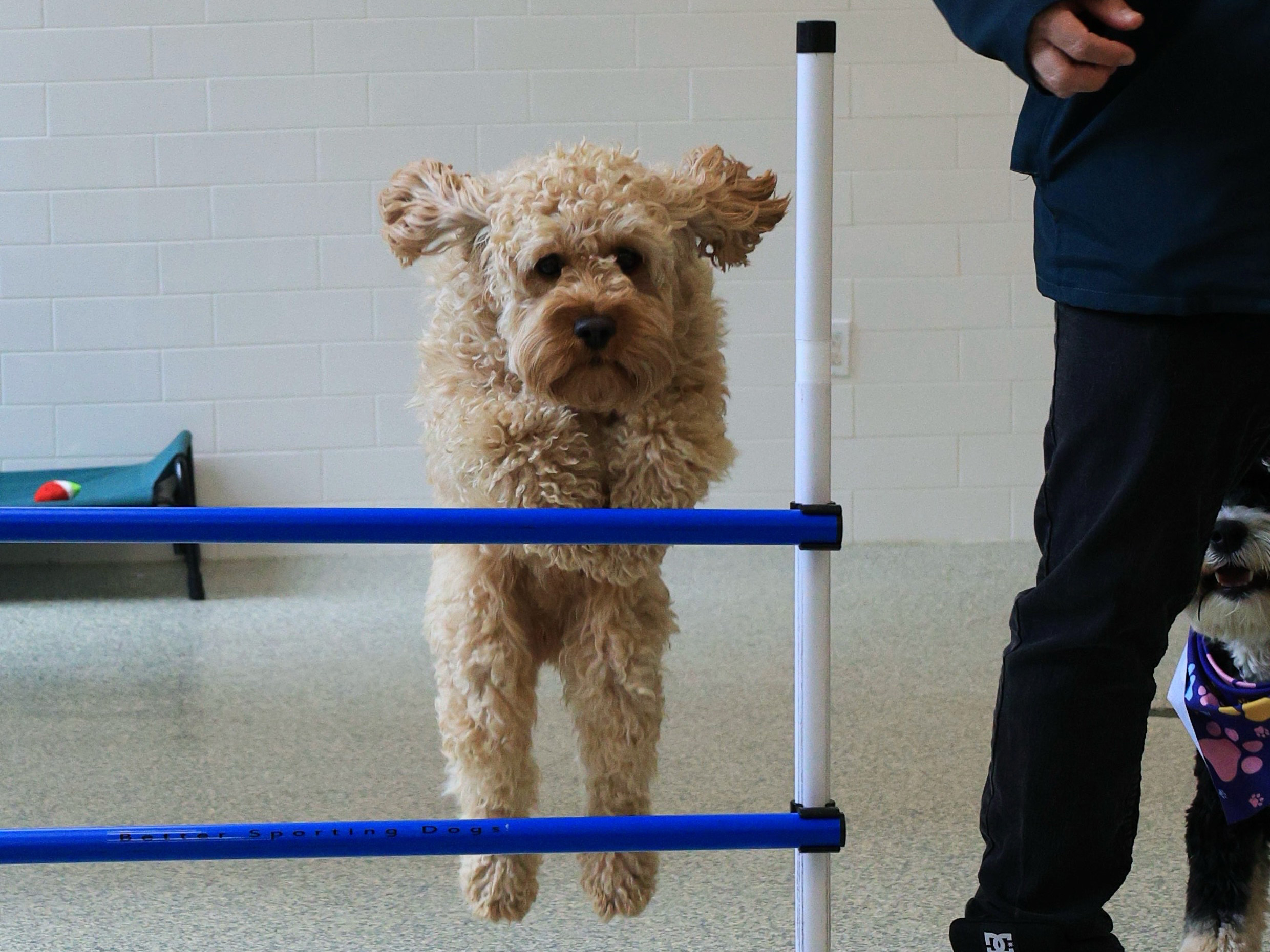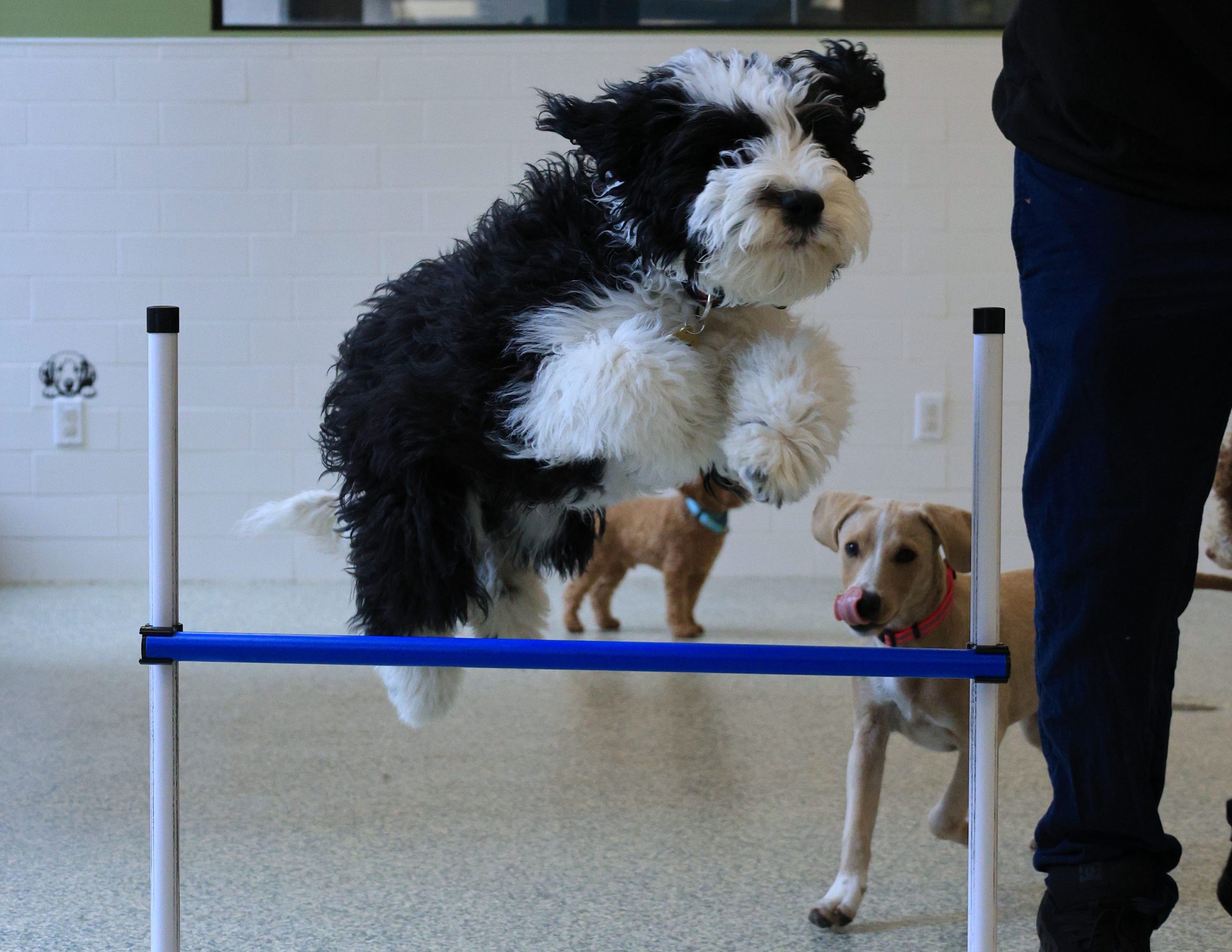 Through a guided circuit with tunnels, ramps, jumps, balance beams, and weave poles, dogs improve coordination, focus, and confidence — all while having a great time!